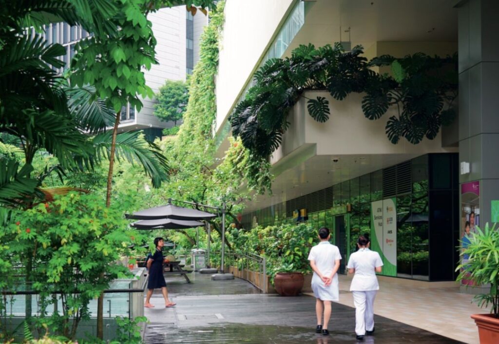 与新加坡其它历史悠久的医院相比,邱德拔医院的设计布局以其生态绿化、节能环保与便利舒适的患者体验而闻名,有着“花园中的医院,医院里的花园”的美誉。整个医院坐落在郁郁葱葱的绿色植物中,帮助患者在舒缓的环境中得到适当的休息,而开放的公共空间和便捷的通道让医院完美的与周边社区融合在一起,让医院的院区花园成为了附近居民进行活动和休息的场所。